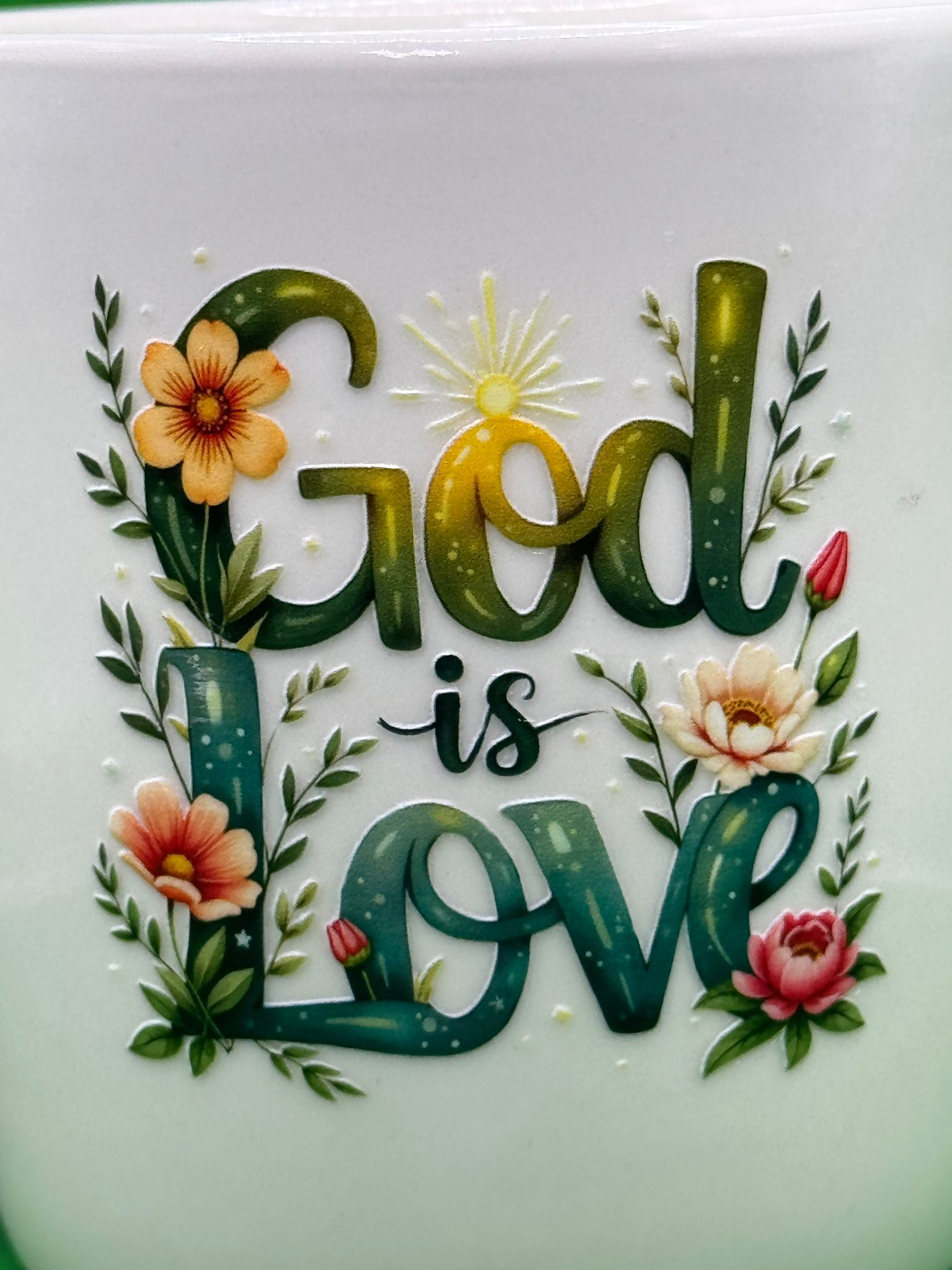 Let your mug speak your faith. This 12oz ceramic mug features the uplifting message God Is Love in a soft, floral UV DTF design that’s as beautiful as it is meaningful. Whether you're sipping coffee or tea, this mug is a gentle daily reminder of divine love.